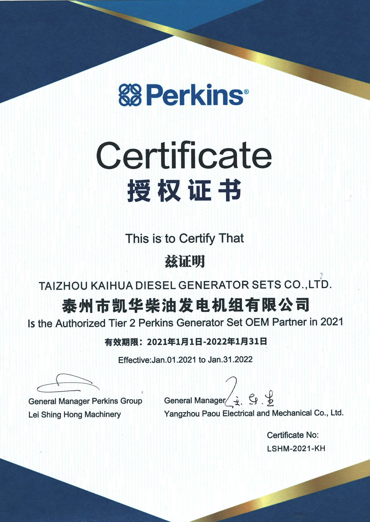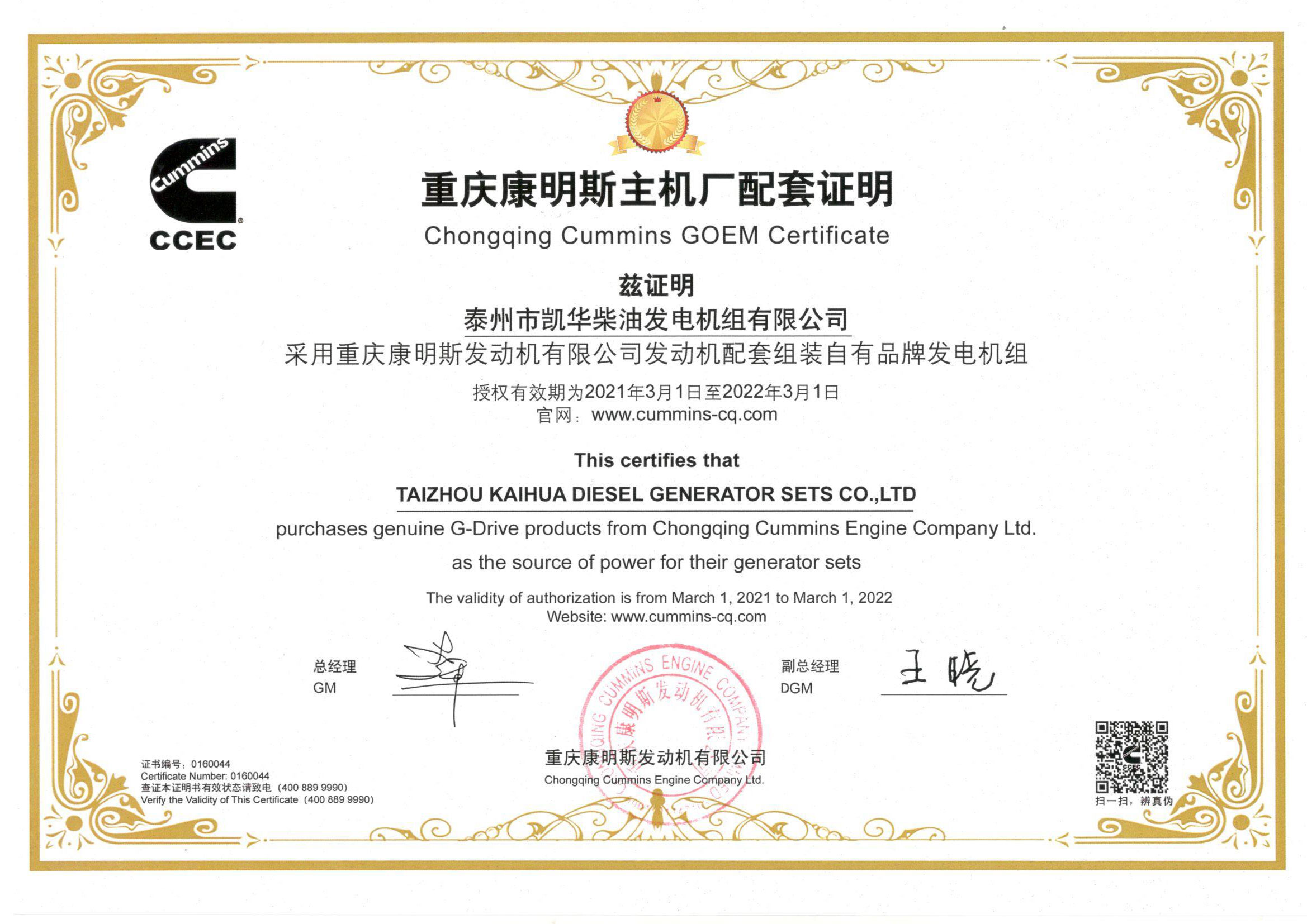 泰州市凱華柴油發電機組有限公司創建于2003年,是一家集柴油發電機組的研發、生產、銷售為一體的高新技術民營企業,公司目前注冊資本金11800萬元人民幣,生產基地占地六十畝,現有各類高素質員工一百多名,專業技術人員達46人,其中高級技術人員16人,年銷售額近6億元。公司主營產品:3~3000KW陸用柴油發電機組,15~600KW移動拖車電站,12~1000KW船用應急柴油發電機組,各種靜音型、中高壓、多機并聯、燃氣等特種機組以及進口系列柴油發電機組,可滿足不同客戶的不同電力需求,還可滿足用戶不同電壓、不同頻率的要求。